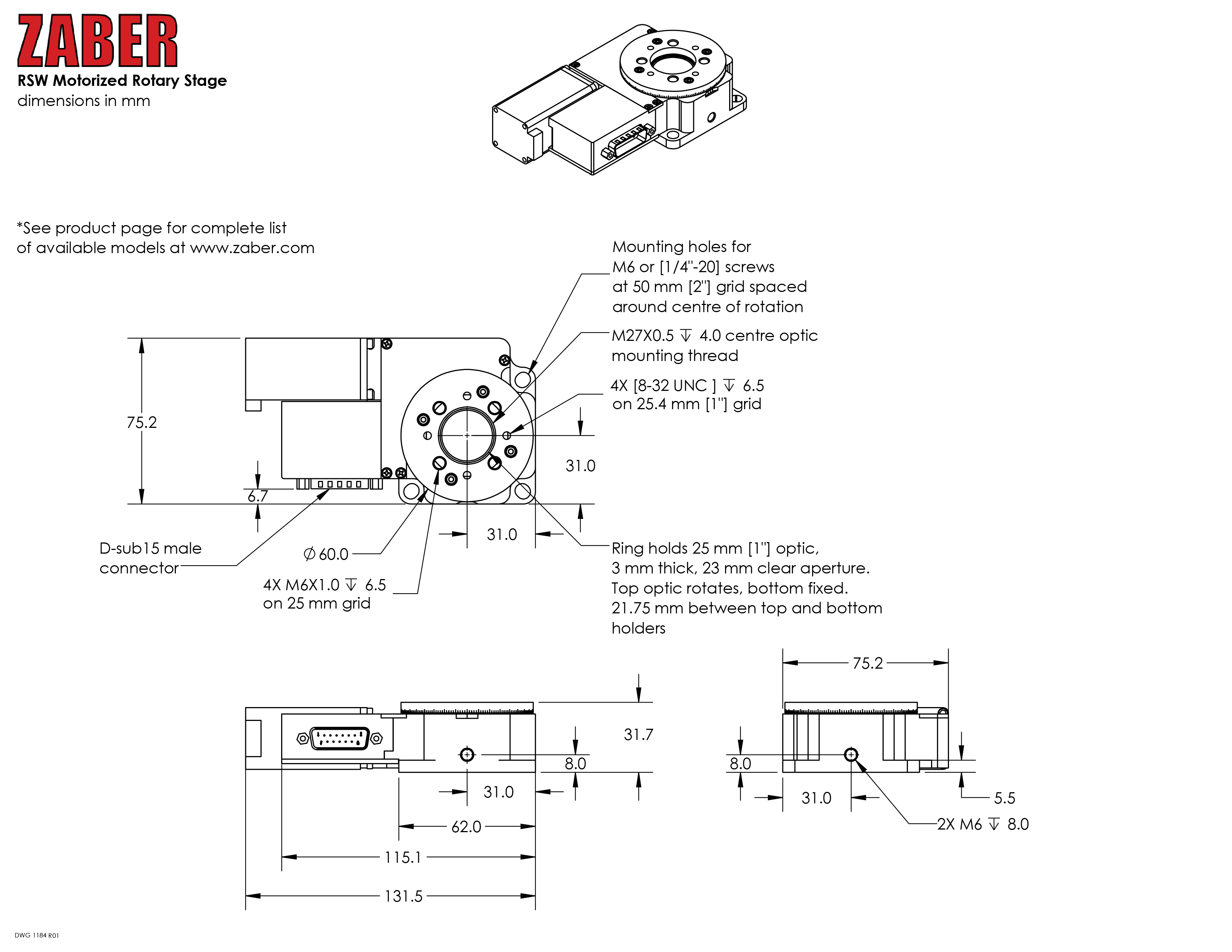 8. 底面と両側面に穴があり、柔軟な取り付けオプションを提供します。他のZaberステージに直接取り付けることもできます。